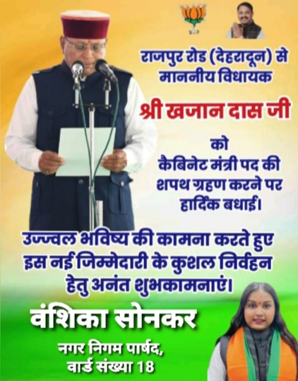 देहरादून। युवा भाजपा नेत्री, प्रसिद्ध समाज सेवी एवं वार्ड संख्या 18 इंदिरा कॉलोनी की नगर निगम पार्षद वंशिका सोनकर ने वरिष्ठ भाजपा नेता व राजपुर रोड विधायक खजान दास के कैबिनेट मंत्री बनने पर उन्हें हार्दिक बधाई एवं शुभकामनाएं दी हैं।