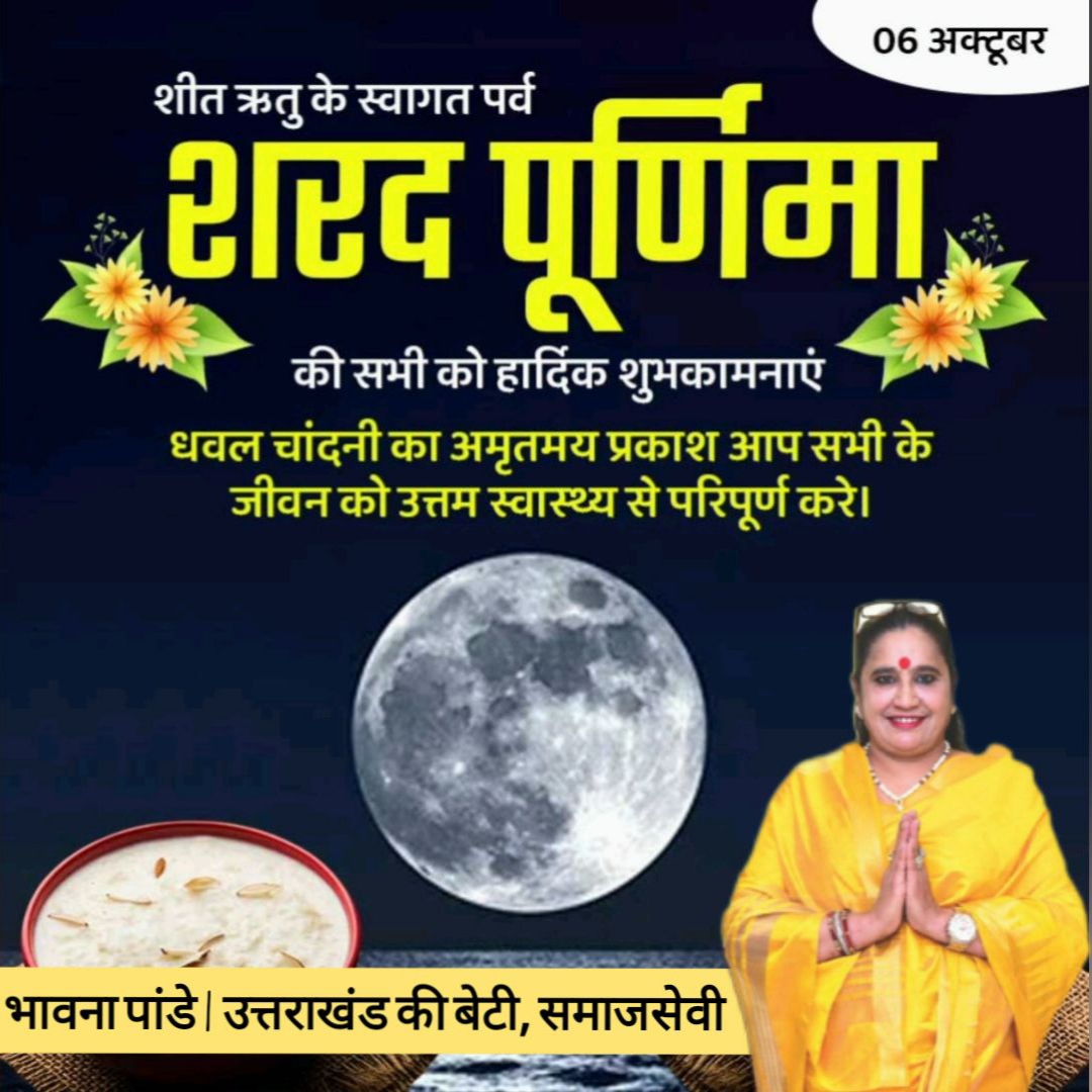 इस पावन अवसर पर अपने संदेश में उत्तराखंड की बेटी भावना पांडे ने कहा- आप सभी को ‘शरद पूर्णिमा’ के पावन अवसर पर हार्दिक बधाई एवं शुभकामनाएं। ‘शरद पूर्णिमा’ का दिव्य प्रकाश सभी के जीवन में सुख, स्वास्थ्य, सौभाग्य और नई संभावनाओं का संचार करे, यही कामना है।